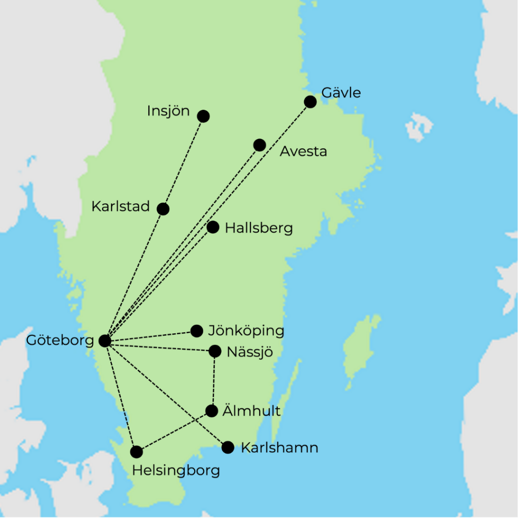 Varje vecka transporterar vi gods smidigt på järnväg till och från hamnarna i Göteborg och Helsingborg. Våra intermodala transporter kopplar samman nio orter med Göteborgs hamn och tre med Helsingborg. Med daglig matartrafik i Nässjöområdet erbjuder vi även snabba och flexibla lösningar nära kunden.